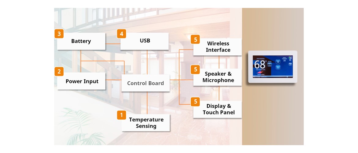 Wireless interface allows the smart thermostat to communicate with HVAC appliances and other devices; while user interface receives commend from users’ voice or direct touch. Both the wireless interfaces and user interfaces are threatened by ESD and recommended to protect by ESD suppressors (LCP series or ESD TVS).