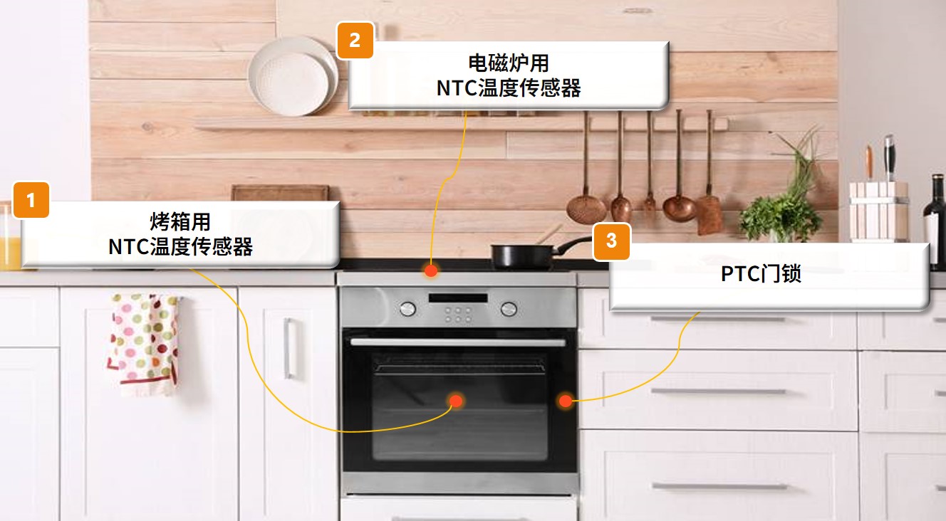 現代電烤箱提供熱對流功能,達成快速均勻的烘烤效果,而多功能烤箱如蒸烤箱、微波烤箱則提供不同烹調方式和溫度設定。為了控制加熱,烤箱內通常須安裝溫度傳感器,偵測熱空氣溫度。適用于烤箱的NTC溫度傳感器,封裝于不銹鋼外殼并使用耐高溫線(xiàn)材,傳感器(頭部)可測量高達300°C的溫度。